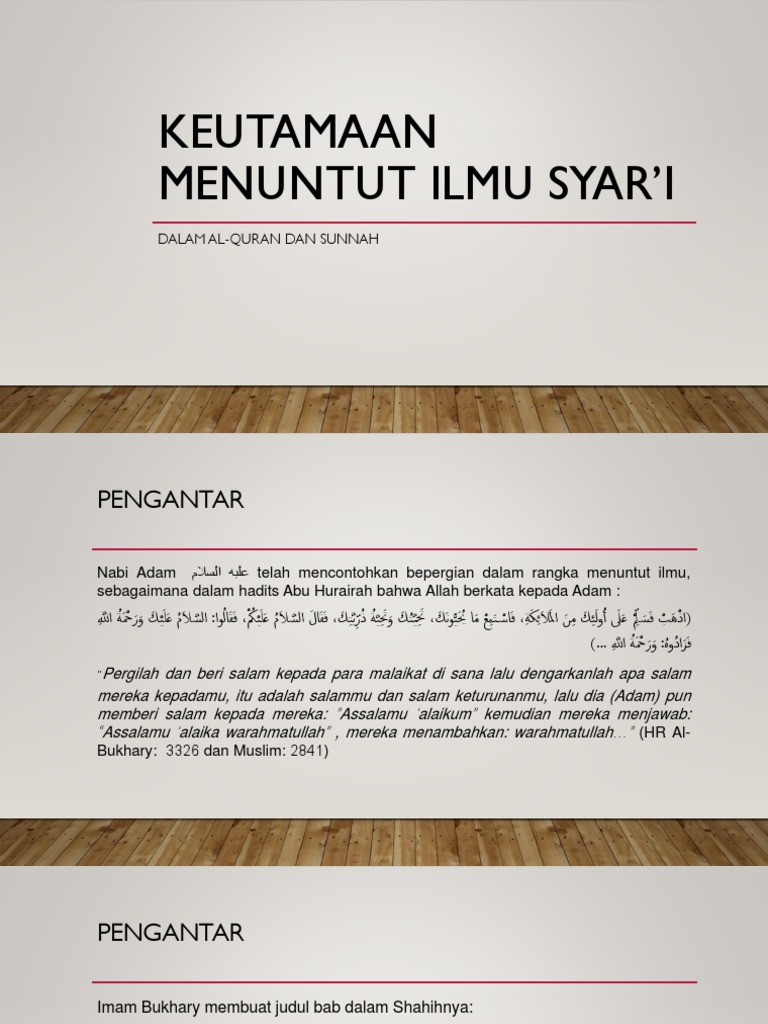 Barangsiapa yang keluar dari rumahnya untuk menuntut ilmu syari pen maka ia sedang berada di jalan allah sampai ia kembali kerumahnya pen. Oleh karena itu merupakan sebuah kesalahan sebagian orang yang membawakan dalil dalil tentang kewajiban dan keutamaan menuntut ilmu dari al quran dan as sunnah tetapi yang mereka maksud. Hadits diriwayatkan oleh imam at tirmidzi hadits tentang ilmu no3.