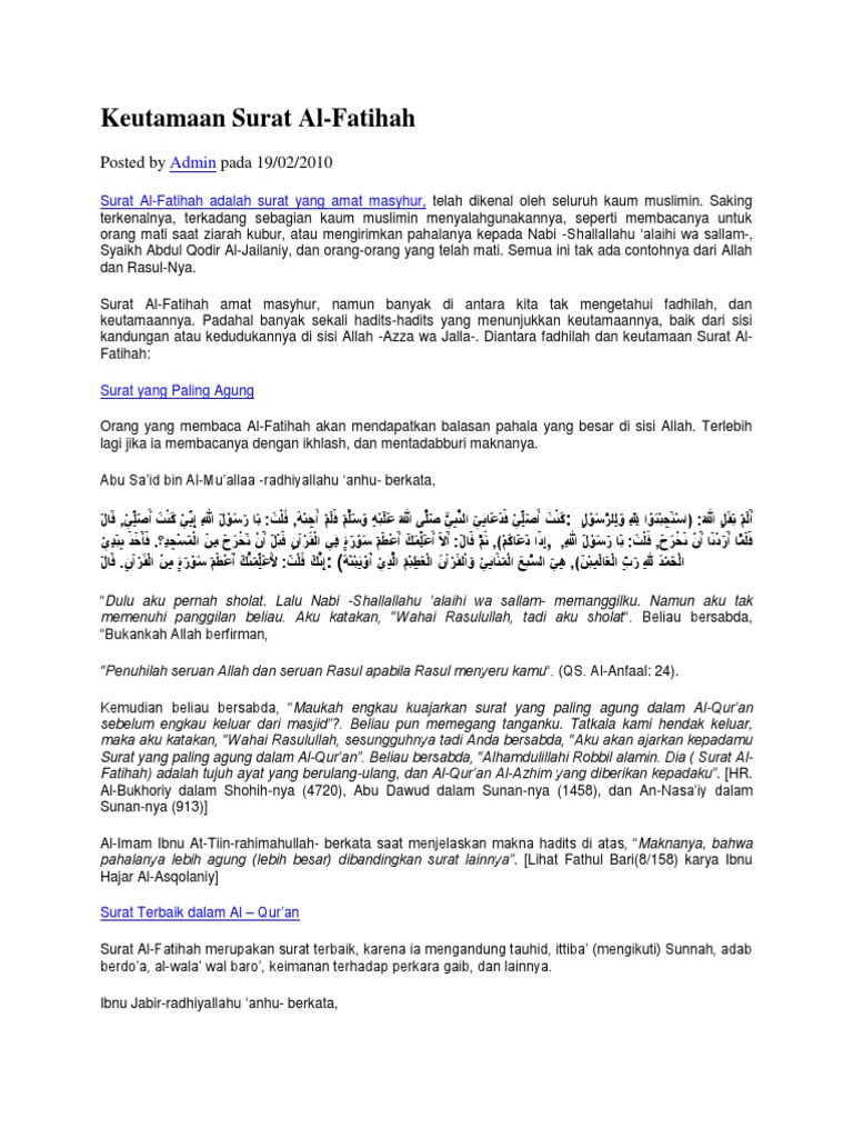 Maktabah al iman lihat juga fath al bari 962 cet. Al fatihah dikenal sebagai surat paling awal dalam al quran tapi apakah kita tahu tentang keutamaan dan khasiat membaca surat al fatihah. Umat muslim mengetahui bahwa shalat yang mereka lakukan tidak akan sah jika mereka tidak membaca surat yang satu ini yaitu surat al fatihah dan hal ini juga diriwayatkan oleh beberapa orang terutama rasulullah saw yang mengatakan bahwa shalat orang.