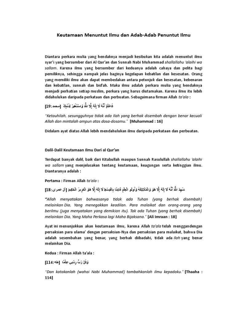 Hadits keutamaan menuntut ilmu dan penjelasannya pengertian ilmu dan menuntut ilmu ilmu berasal dari bahasa arab kata aalm masdar dari yang berarti hadits keutamaan menuntut ilmu dan penjelasannyapengertian ilmu dan menuntut ilmuilmu berasal dari bahasa arab kata aalm masdar dari yang berarti mengetahui. Dengan demikian ilmu tentang al quran dan as sunnah adalah ilmu yang memiliki keutamaan yang agung di mana pemiliknya beramal atasnya dengan pemahaman yang benar sehingga allah swt mengangkat derajat dan memuliakannya. Meskipun demikian bukan berarti kita mengingkari manfaat belajar ilmu duniawi.