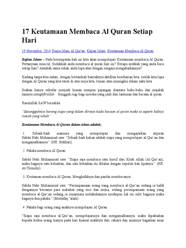 Hadits hadist tentang keutamaan membaca al quran bulan ramadhan merupakan bulan al quran. Hadits hadits keutamaan membaca al quran. Dalam kitab jamu1 fawaid terdapat sebuah hadits yang diriwayatkan oleh thabrani dari anas ra.