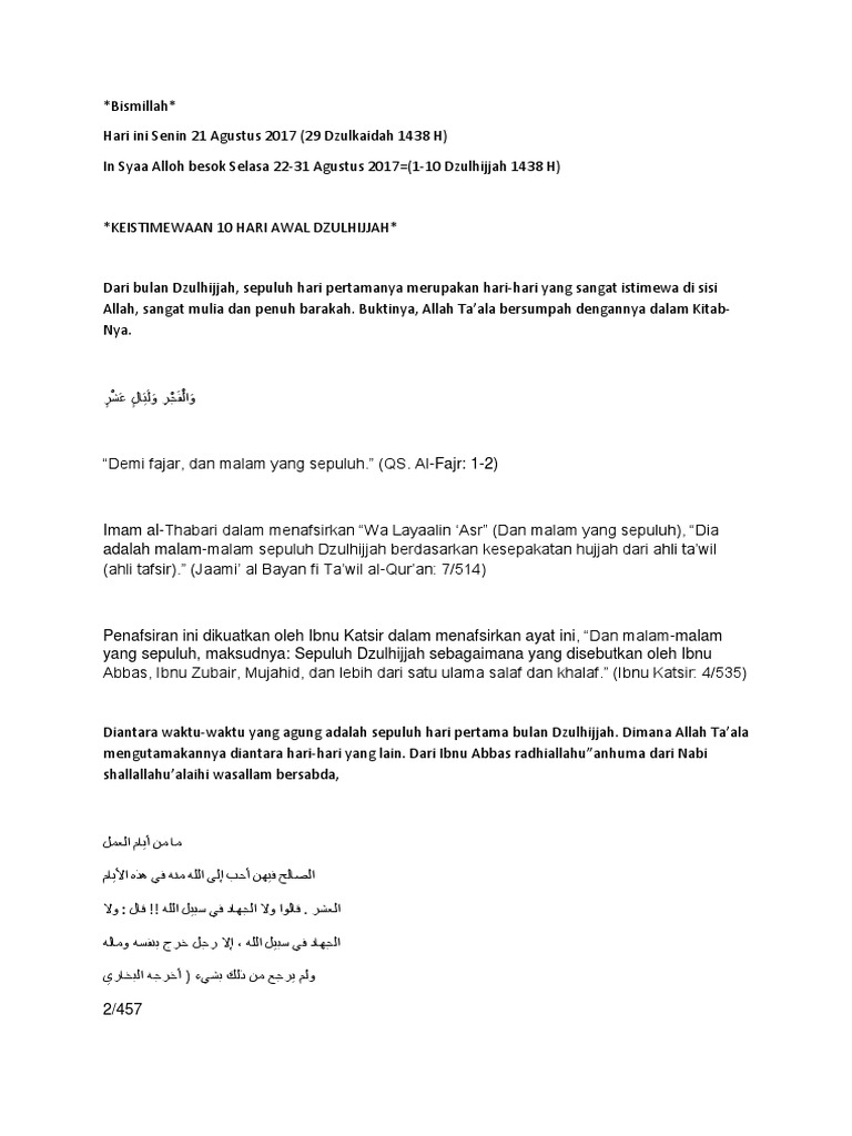 Pada masa itu amal saleh yang dikerjakan menjadi sangat dicintai allah bahkan melebihi jihad fi sabilillah. Dalil lain yang menunjukkan keutamaan 10 hari pertama dzulhijah adalah firman allah taala. Rasulullah shallallaahu alaihi wa sallam bersabda.